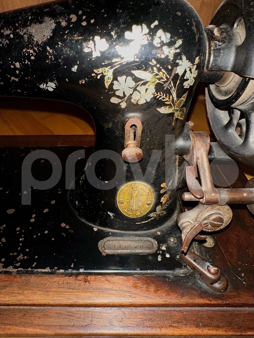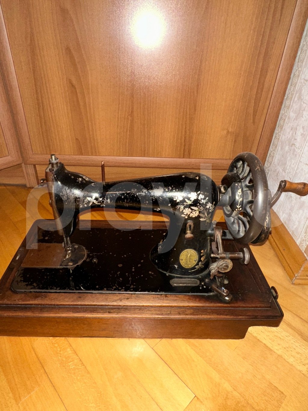 Maşın öz orijinal taxta altlığı ilə birlikdədir. Korpus üzərində zamanla bağlı təbii aşınma və istifadə izləri mövcuddur. Bu hal antik əşyalar üçün xarakterikdir və onun tarixi dəyərini əks etdirir.