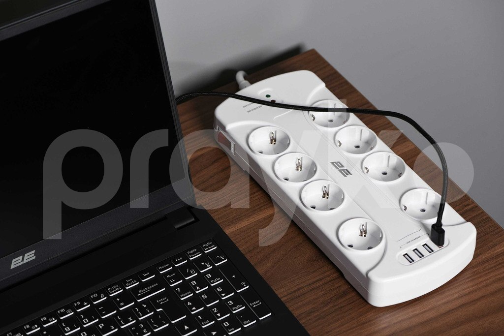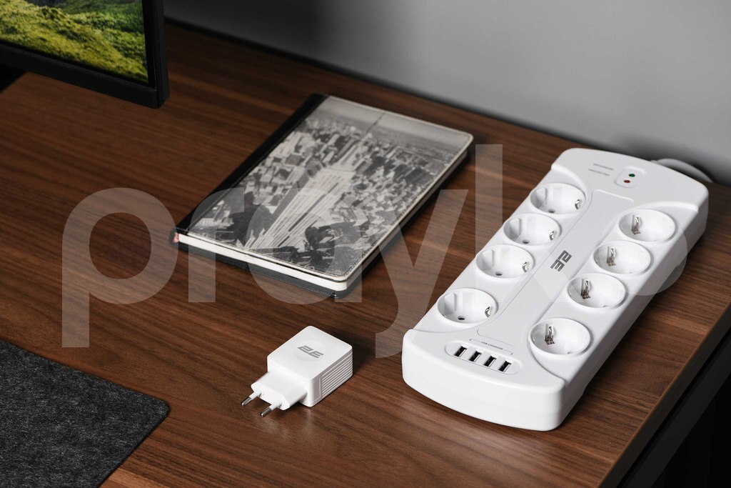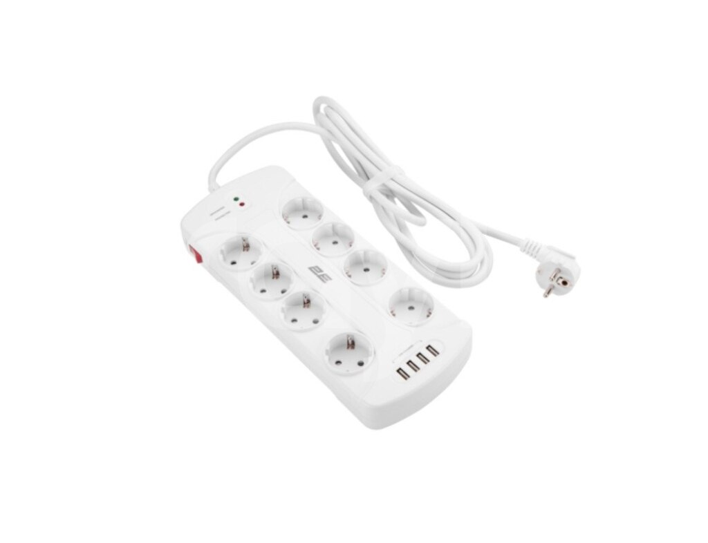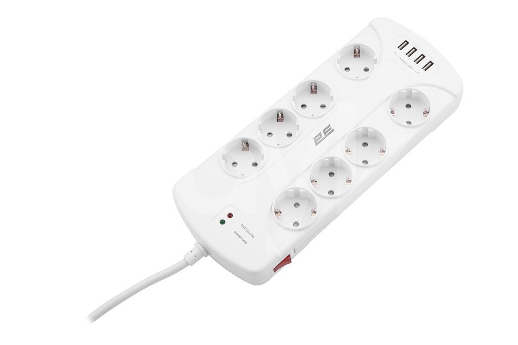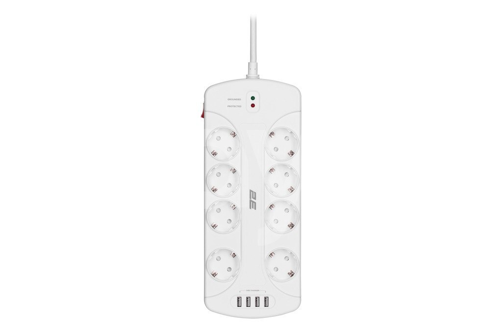 2E Power strip with surge protector 8xType F, 3x1.5mm2, 16A, 4xUSB-A, 3m, white