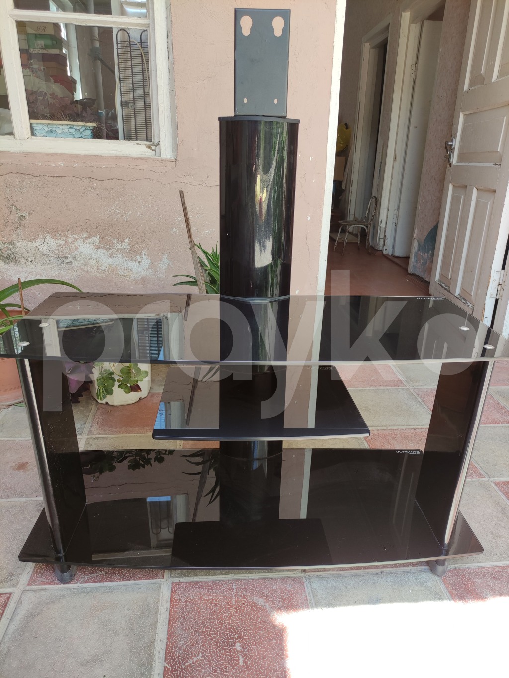 Əlaqə: 055-669-15-49. Şüşə rəfləri və mərkəzi dirəyi olan qara rəngli, müasir dizaynlı televizor stendi. Bu stend televizorunuz üçün möhkəm baza təmin edir və media avadanlıqlarınız üçün əlavə rəflər təklif edir. Hər hansı bir ev və ya ofis üçün uyğun, funksional və zərif bir mebel parçasıdır.